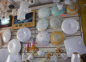 Большой ассортимент светильников, посуды, электрики, картин, часов и пластмассовых изделий (бассейны, ёмкости для воды).